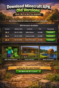 Minecraft terus berkembang dengan pembaruan yang sering, tetapi tidak semua versi bekerja sempurna di setiap perangkat. Halaman ini memungkinkan Anda untuk mengunduh versi lama Minecraft APK terbaru, termasuk versi 26.0, 26.1, dan 26.2 — ideal bagi pengguna yang lebih menyukai stabilitas, kompatibilitas, atau fitur tertentu.